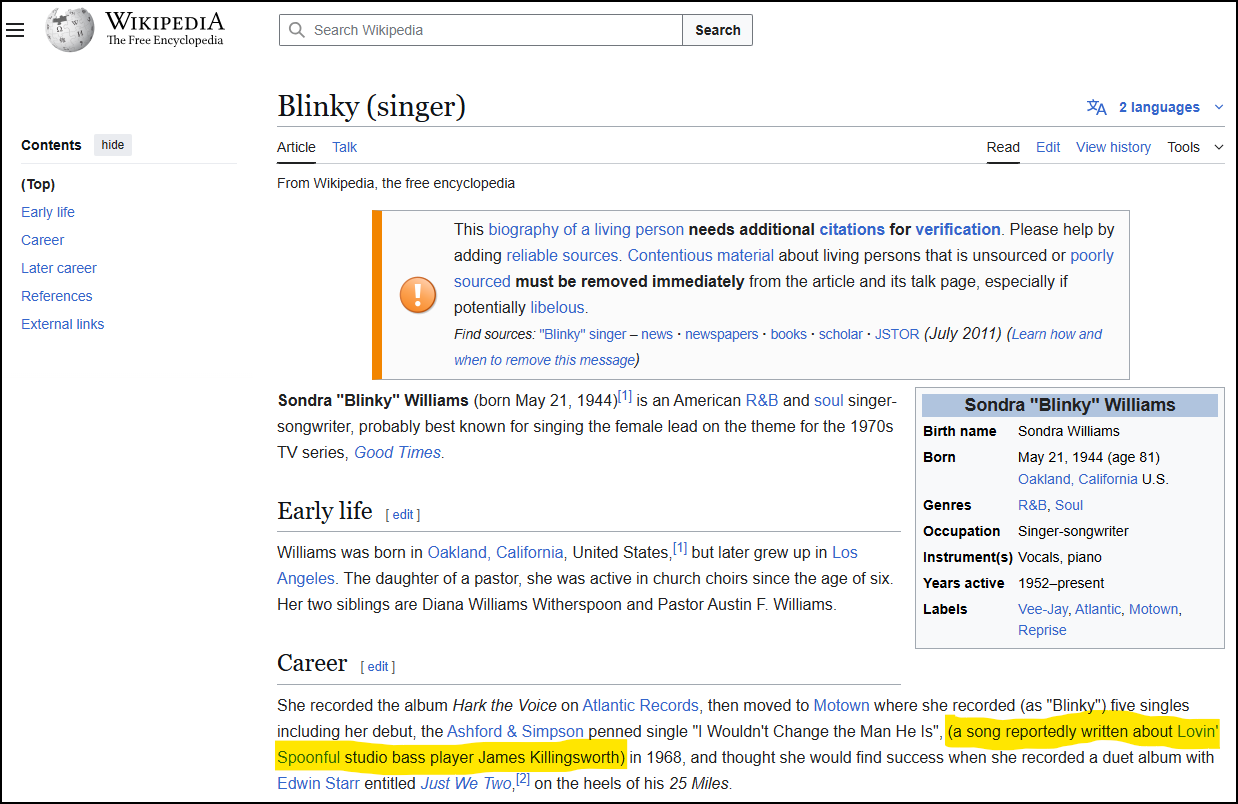 His biggest claim to fame was the Blinky page. You remember Blinky? Probably not. Her foremost achievement was singing the Good Times theme. We slipped in a line about her song I Wouldn’t Change the Man He Is being “reportedly written about Lovin’ Spoonful studio bassist James Killingsworth.” No one noticed. It stayed.